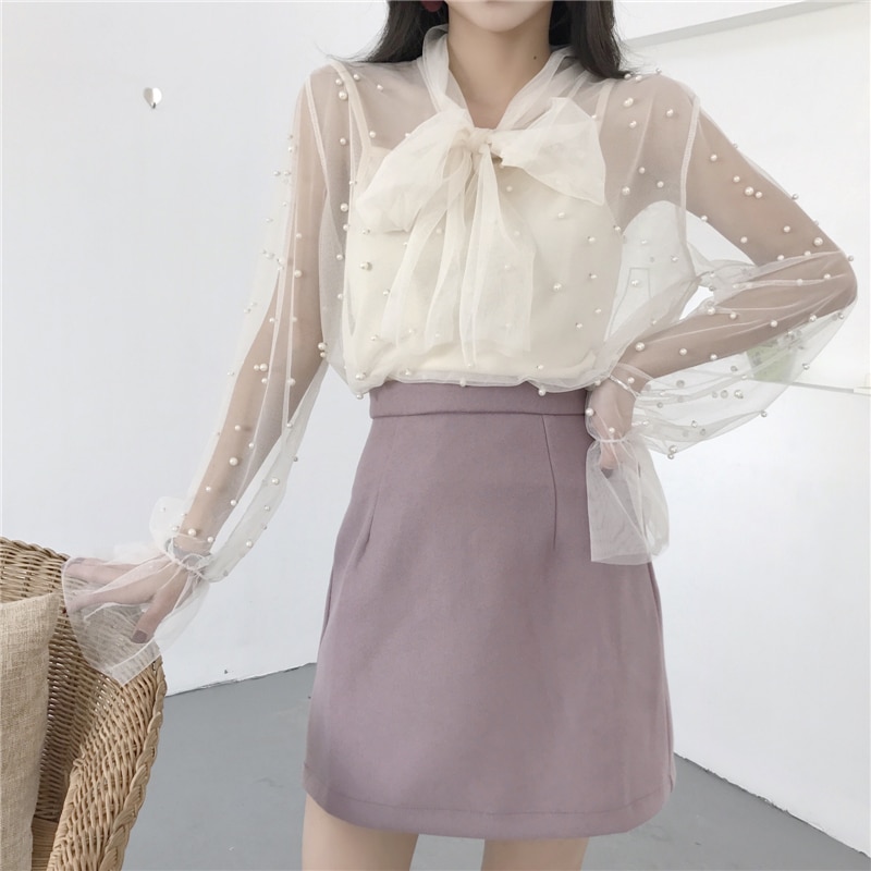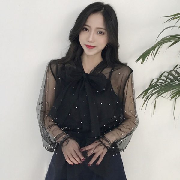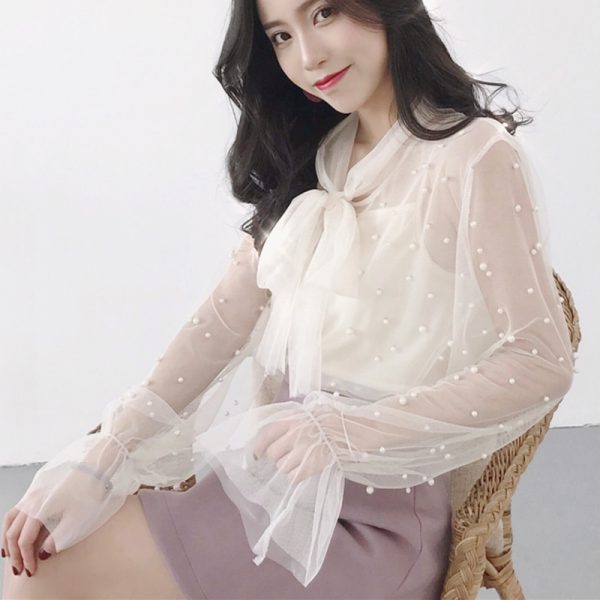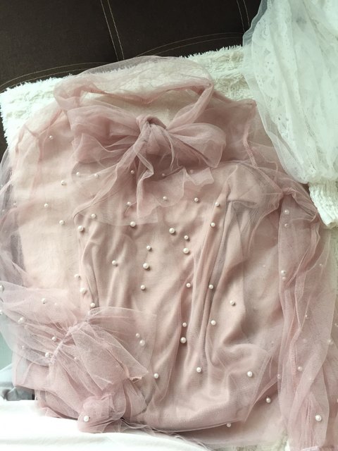 2021 Autumn Women Chiffon Shirt Gauze Bow Beading Pink White Blosue with Lace Lady’s Tops Female Office Shirts Blusa 4323 50